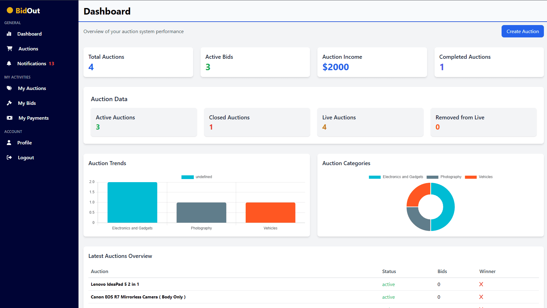 BidOut is a secure auction system that uses a 10% upfront fee to prevent fake bids. It features automatic bid validation, winner selection, and payment handling with a clear 24-hour payment window.