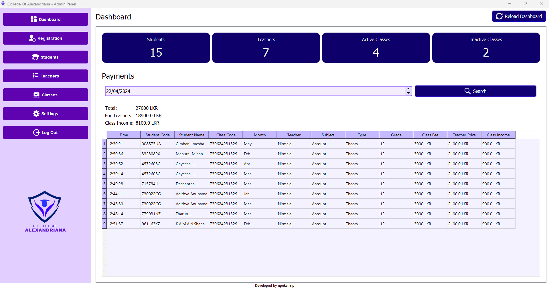 I developed a comprehensive system for College Of Alexandriana, Nittambuwa, to streamline registration, payments, class management, and reporting. This user-friendly solution enhances efficiency and transparency, effectively managing students, teachers, and classes.